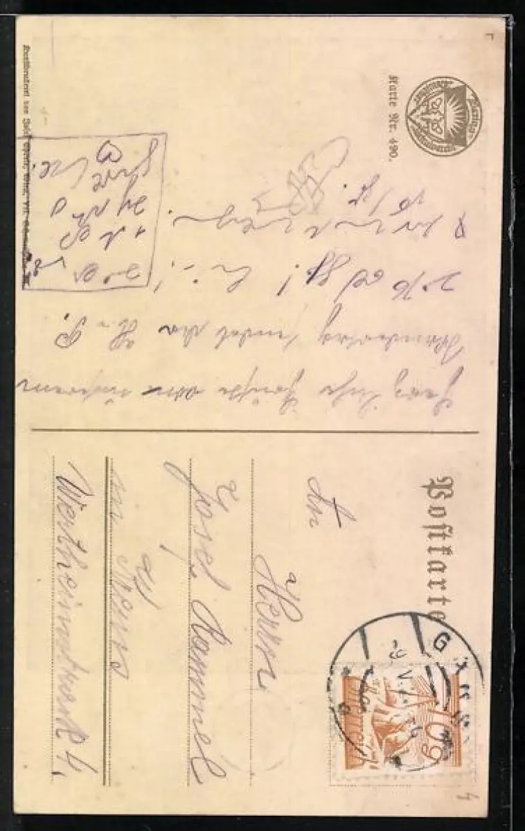 Personenbezogene Daten auf der Rückseite der Karte wurden durch blauen Textmarker unkenntlich gemacht. Die blauen Stellen sind auf die Vorderseite durchgeweicht und wirken sich negativ auf das Postkartenfoto aus
