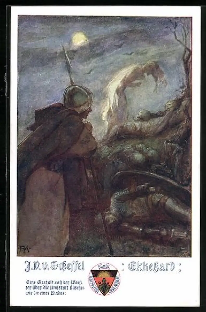 AK Deutscher Schulverein NR 497: J. v. Scheffel, Ekkehard, Wächter sieht eine Gestalt übers Schlachtfeld huschen