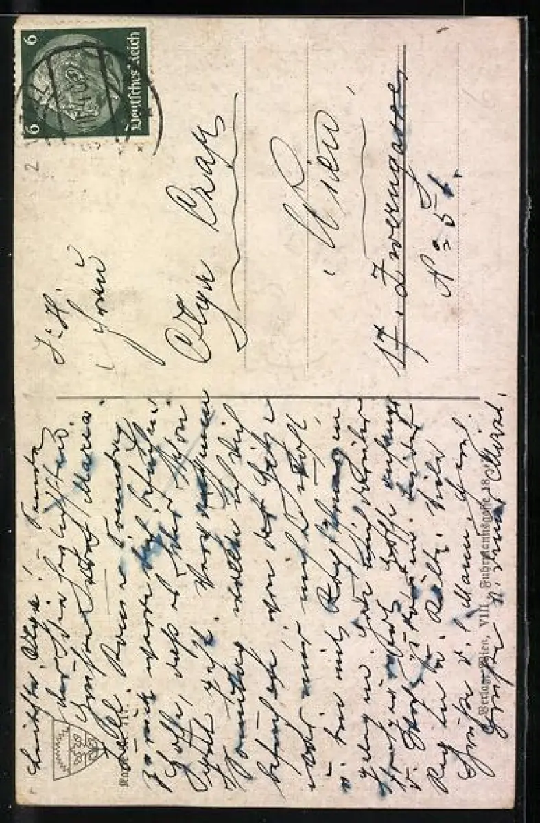 Personenbezogene Daten auf der Rückseite der Karte wurden durch blauen Textmarker unkenntlich gemacht. Die blauen Stellen sind auf die Vorderseite durchgeweicht und wirken sich negativ auf das Postkartenfoto aus