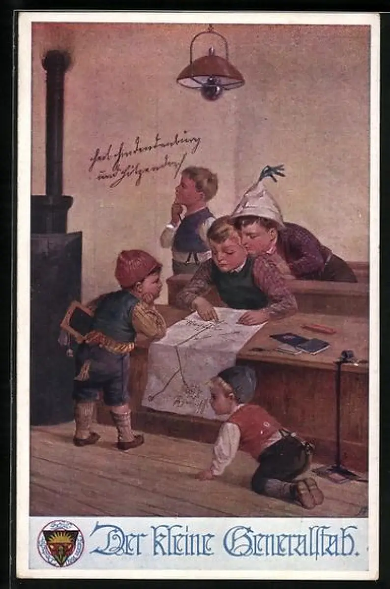 AK Deutscher Schulverein NR: 750, Kinder spielen Krieg, Der kleine Generalstab an der Kriegskarte