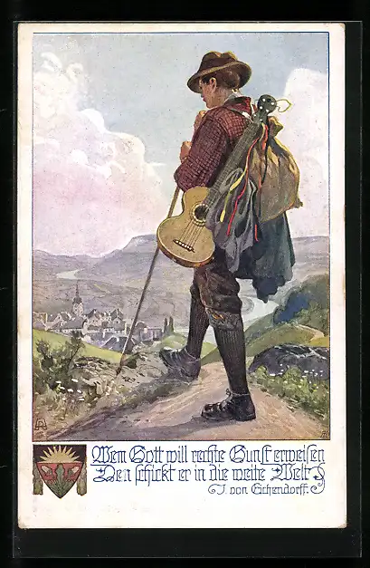 AK Deutscher Schulverein NR 878: Wanderer mit Gitarre geht auf eine Stadt zu