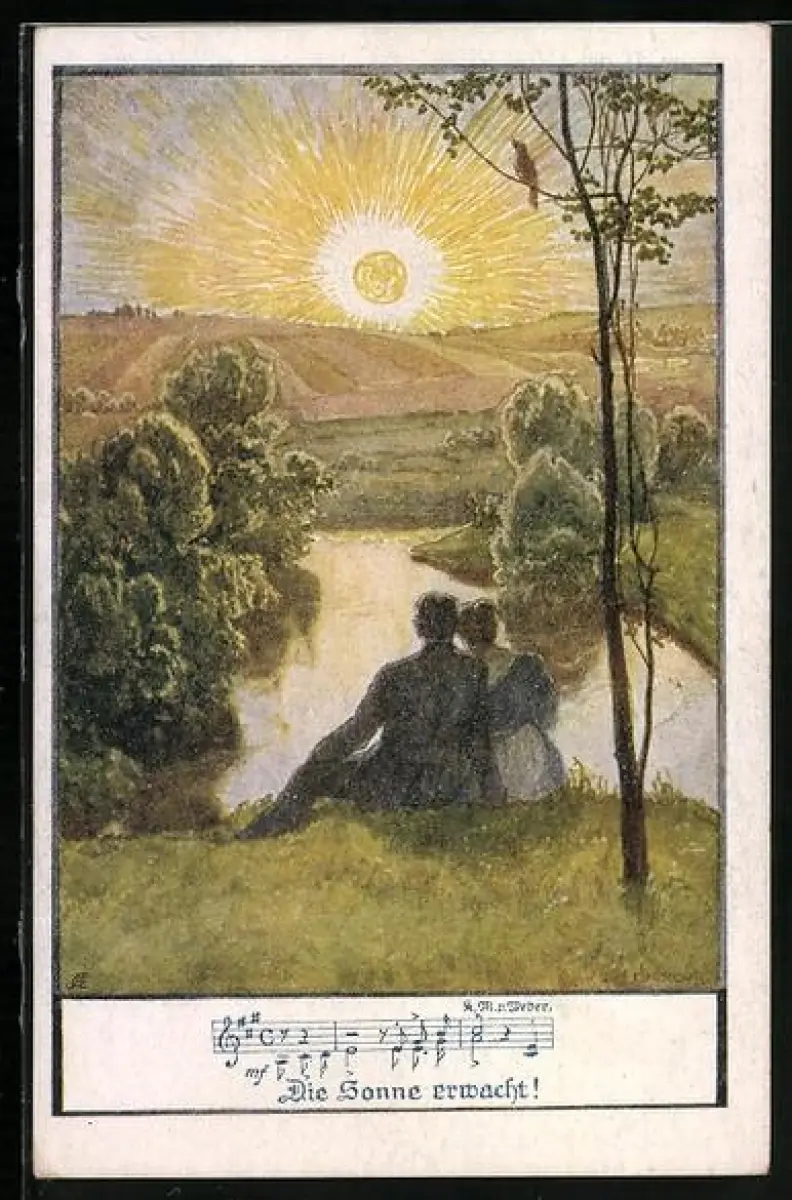 AK Deutscher Schulverein Nr. 1248: Verliebtes Paar blickt in den Sonnenaufgang, Die Sonne erwacht