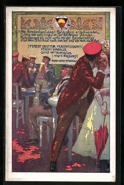 AK Deutscher Schulverein Nr. 240: Pärchen küsst sich, Im Hintergrund feiernde Studenten, studentische Szene