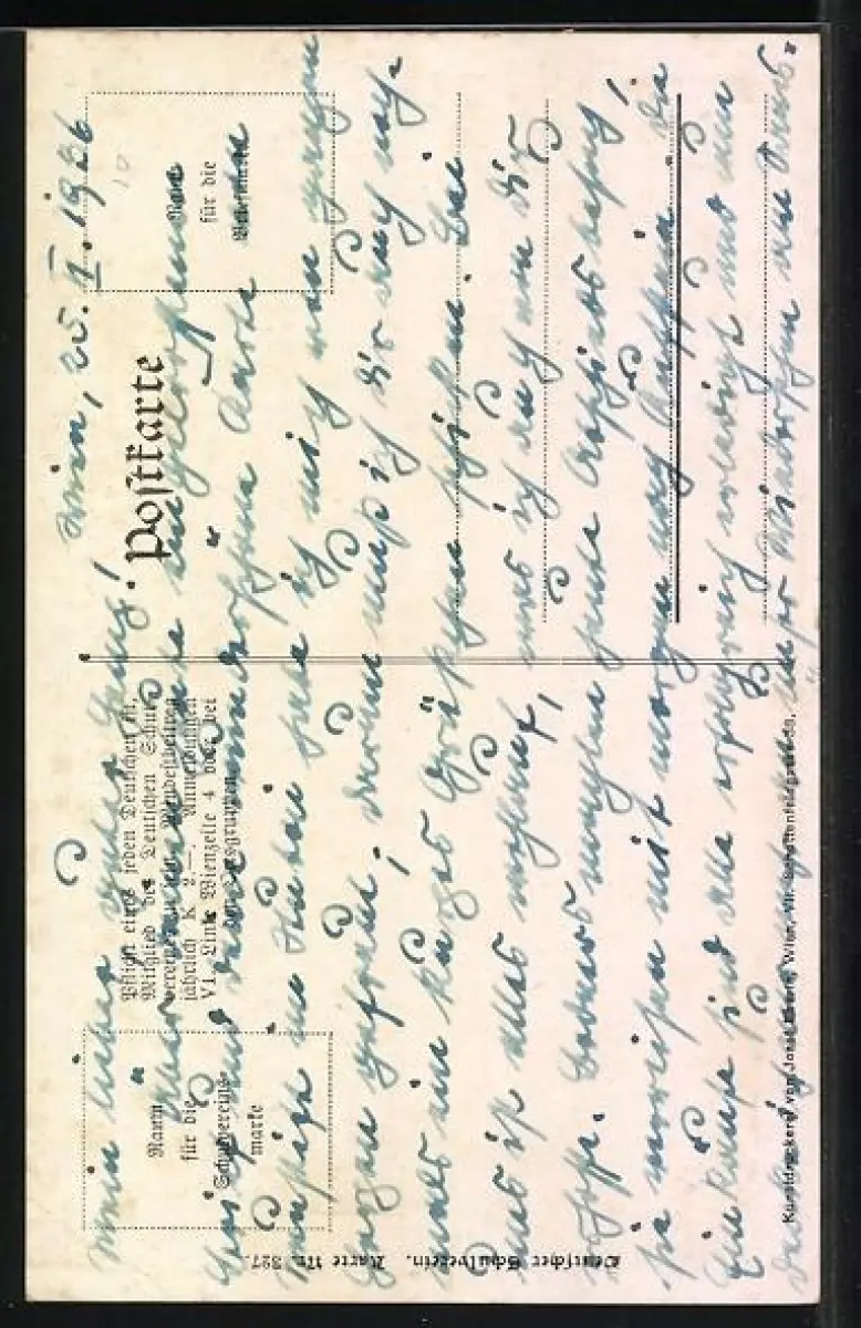 Personenbezogene Daten auf der Rückseite der Karte wurden durch blauen Textmarker unkenntlich gemacht. Die blauen Stellen sind auf die Vorderseite durchgeweicht und wirken sich negativ auf das Postkartenfoto aus