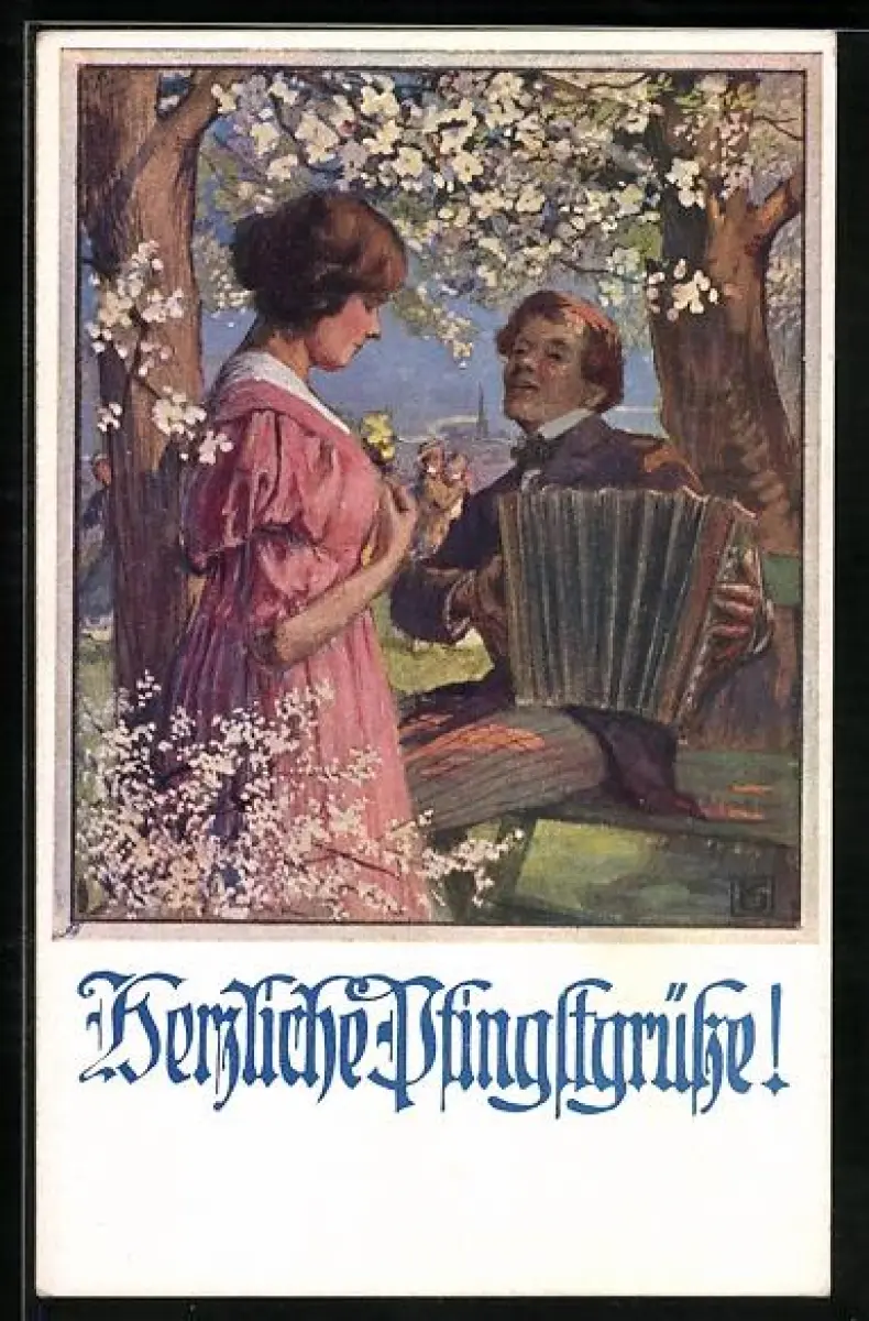 AK Deutscher Schulverein Nr. 613: Herzliche Pfingstgrüsse, Mann mit Akkordeon spielt für seine Herzensdame