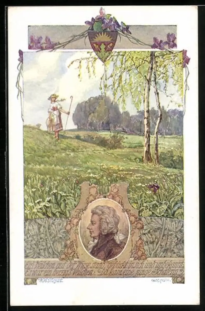 AK Deutscher Schulverein Nr. 848: Mädchen spaziert mit Schaf unterm Arm durch blühende Felder
