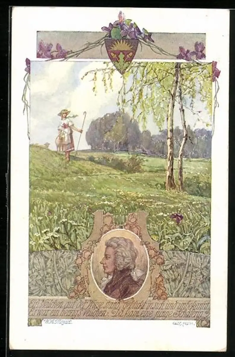 AK Deutscher Schulverein Nr. 848: Mädchen spaziert mit Schaf unterm Arm durch blühende Felder