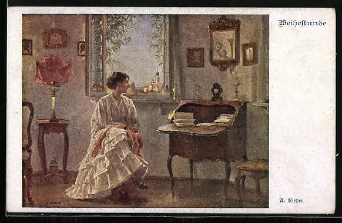 AK Deutscher Schulverein Nr. 980: Weihestunde, Junge Dame am Fenster