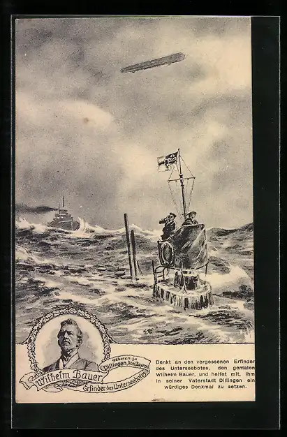 AK Deutsches U-Boot auf der Suche, darüber ein Zeppelin, Wilhelm Bauer, Erfinder des U-Bootes