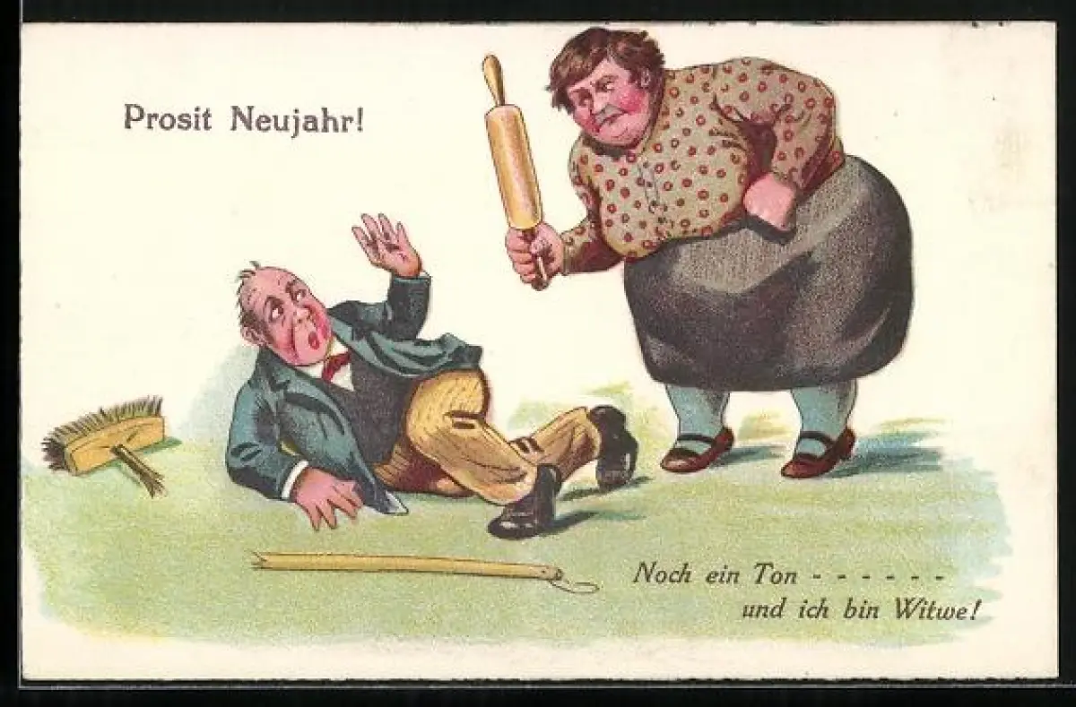 AK Dicke Frau droht Mann mit einem Nudelholz, frauenfeindlicher Humor