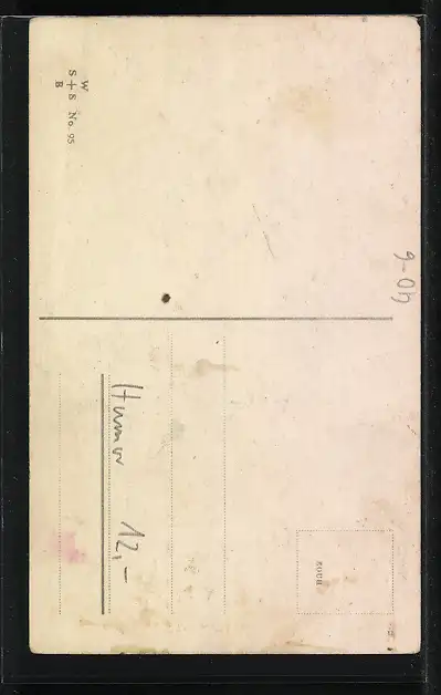 Personenbezogene Daten auf der Rückseite der Karte wurden durch blauen Textmarker unkenntlich gemacht. Die blauen Stellen sind auf die Vorderseite durchgeweicht und wirken sich negativ auf das Postkartenfoto aus