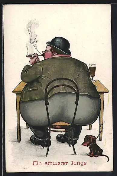 AK Dicker auf einem zu kleinen Stuhl im Wirtshaus, Dackel