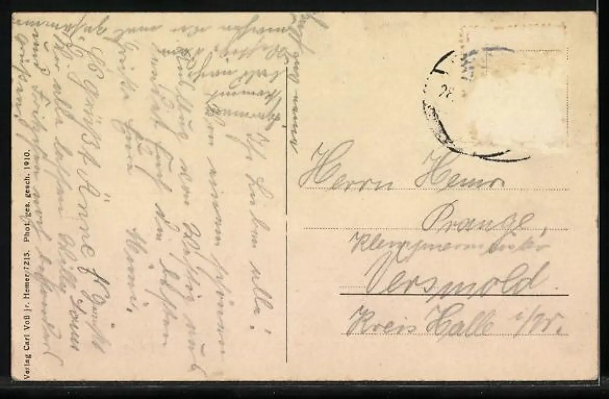 alte Ansichtskarte, gelaufen, Briefmarke entfernt, rückseitig Oberflächenschaden, Bugspur li. oben, guter Zustand
