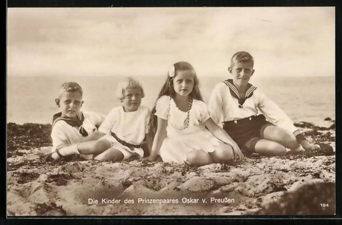 AK Die Kinder des Prinzenpaares Oskar von Preussen, sitzend am Strand