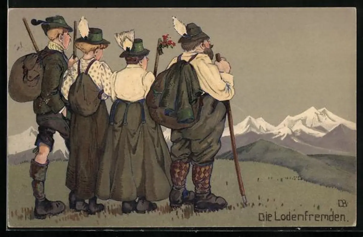 AK Die Lodenfremden, Bergsteiger schauen in die Ferne