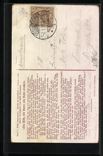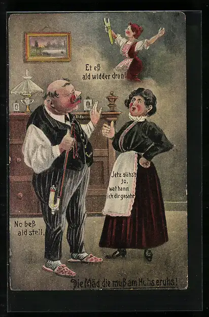 AK Die Mäd, die muss am Huhs eruhs, Mann mit Pfeife und Frau mit Schürze, frauenfeindlicher Humor