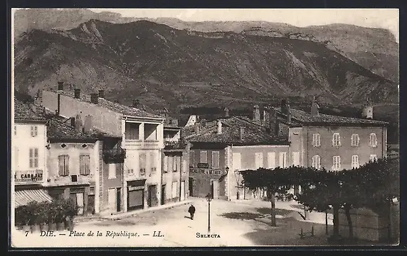 AK Die, Place de la République, vue des bâtiments et des montagnes en arrière-plan