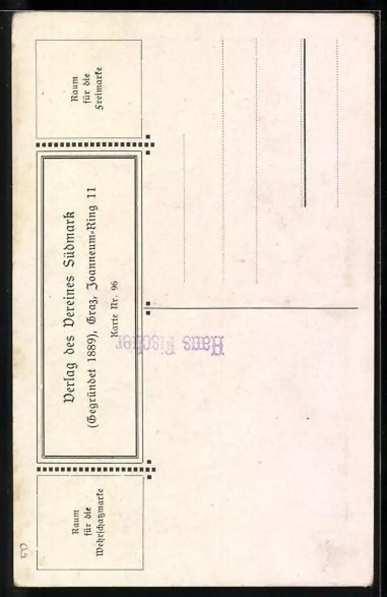 Personenbezogene Daten auf der Rückseite der Karte wurden durch blauen Textmarker unkenntlich gemacht. Die blauen Stellen sind auf die Vorderseite durchgeweicht und wirken sich negativ auf das Postkartenfoto aus