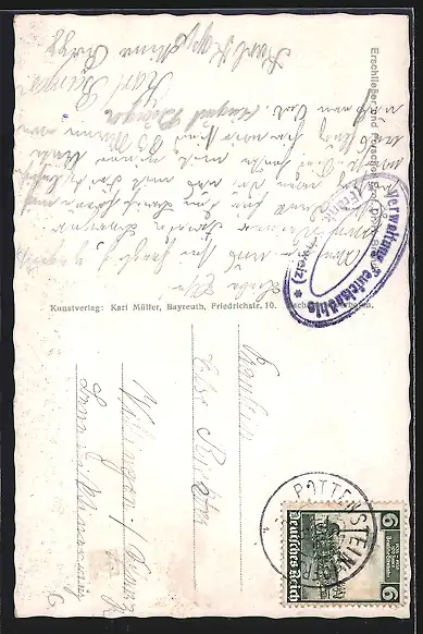 Personenbezogene Daten auf der Rückseite der Karte wurden durch blauen Textmarker unkenntlich gemacht. Die blauen Stellen sind auf die Vorderseite durchgeweicht und wirken sich negativ auf das Postkartenfoto aus