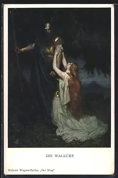 AK Die Walküre, Frau kniet an der Seite eines Kriegers und umfasst flehend seinen Arm