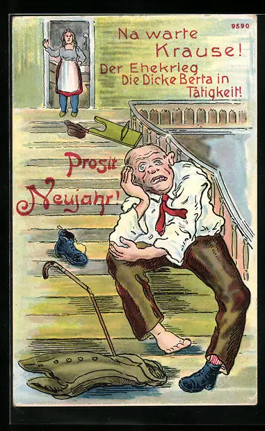 AK Die dicke Berta und Krause auf der Treppe, Neujahrsgruss, frauenfeindlicher Humor