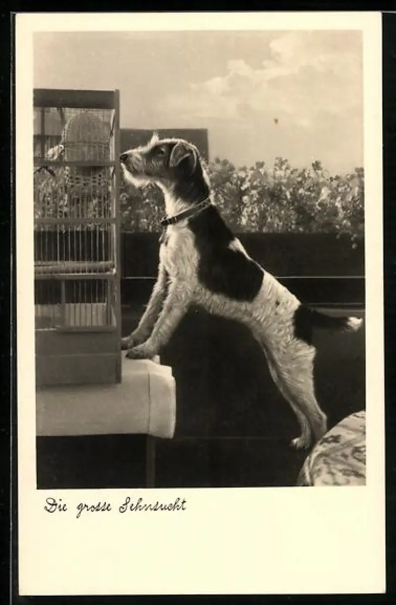 AK Die grosse Sehnsucht, Terrier untersucht Vogelkäfig
