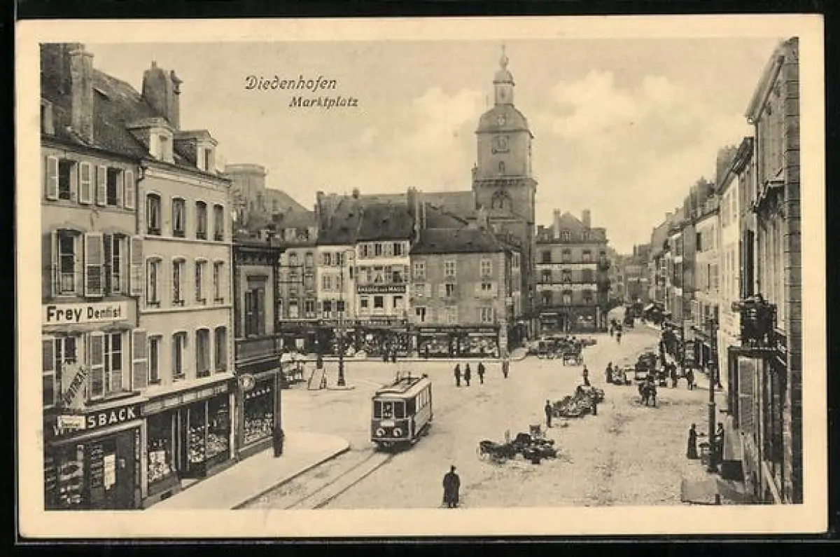 AK Diedenhofen, Marktplatz mit Geschäften und Strassenbahn