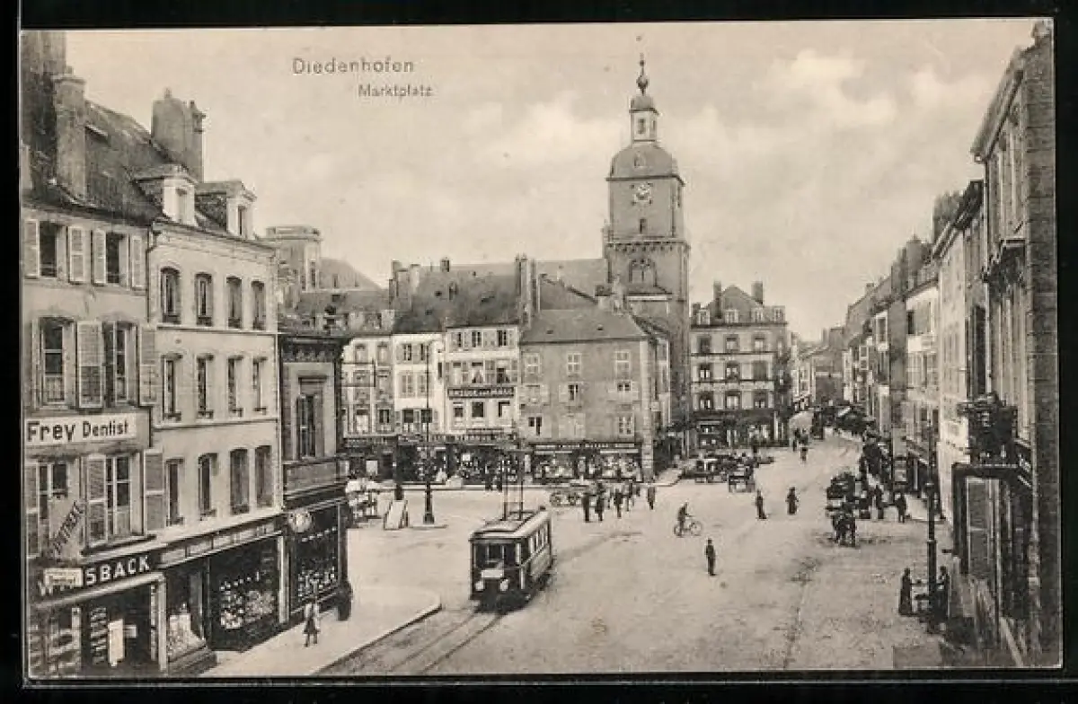 AK Diedenhofen, Marktplatz mit Strassenbahn