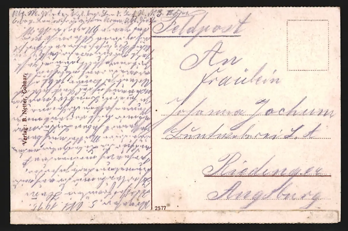 Personenbezogene Daten auf der Rückseite der Karte wurden durch blauen Textmarker unkenntlich gemacht. Die blauen Stellen sind auf die Vorderseite durchgeweicht und wirken sich negativ auf das Postkartenfoto aus