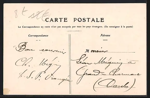 Personenbezogene Daten auf der Rückseite der Karte wurden durch blauen Textmarker unkenntlich gemacht. Die blauen Stellen sind auf die Vorderseite durchgeweicht und wirken sich negativ auf das Postkartenfoto aus