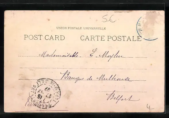 gelaufen 1907, Briefmarke entfernt, rückseitig Oberflächenschaden, Eckknicke li. u. oben re., guter Zustand