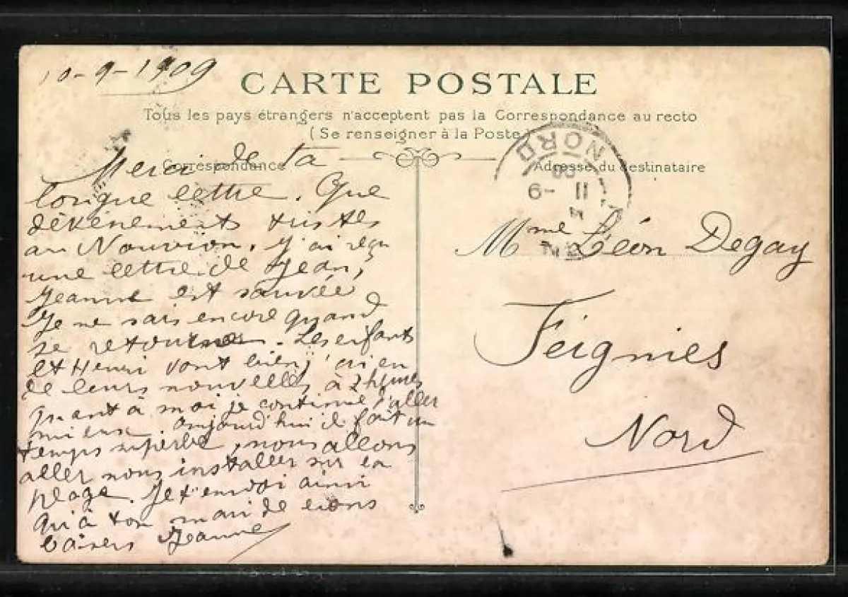 Personenbezogene Daten auf der Rückseite der Karte wurden durch blauen Textmarker unkenntlich gemacht. Die blauen Stellen sind auf die Vorderseite durchgeweicht und wirken sich negativ auf das Postkartenfoto aus