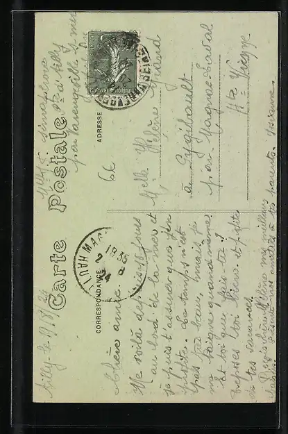 Personenbezogene Daten auf der Rückseite der Karte wurden durch blauen Textmarker unkenntlich gemacht. Die blauen Stellen sind auf die Vorderseite durchgeweicht und wirken sich negativ auf das Postkartenfoto aus