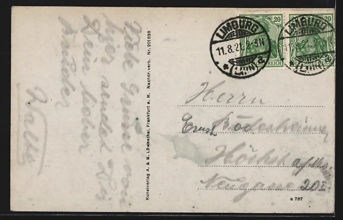 Personenbezogene Daten auf der Rückseite der Karte wurden durch blauen Textmarker unkenntlich gemacht. Die blauen Stellen sind auf die Vorderseite durchgeweicht und wirken sich negativ auf das Postkartenfoto aus