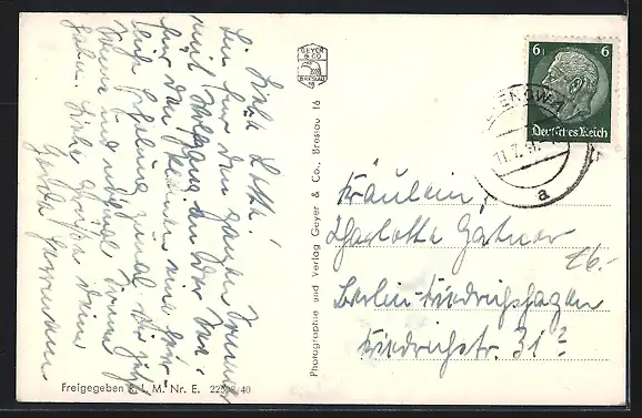 Personenbezogene Daten auf der Rückseite der Karte wurden durch blauen Textmarker unkenntlich gemacht. Die blauen Stellen sind auf die Vorderseite durchgeweicht und wirken sich negativ auf das Postkartenfoto aus