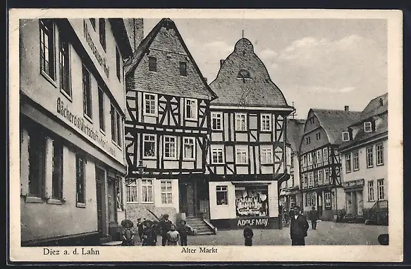 AK Diez a. d. Lahn, Alter Markt mit Bäckerei-Gasthaus u. Geschäft Adolf May