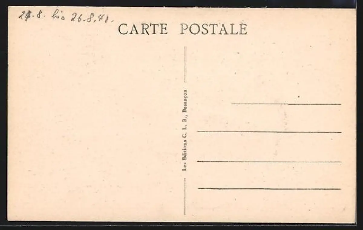 Personenbezogene Daten auf der Rückseite der Karte wurden durch blauen Textmarker unkenntlich gemacht. Die blauen Stellen sind auf die Vorderseite durchgeweicht und wirken sich negativ auf das Postkartenfoto aus
