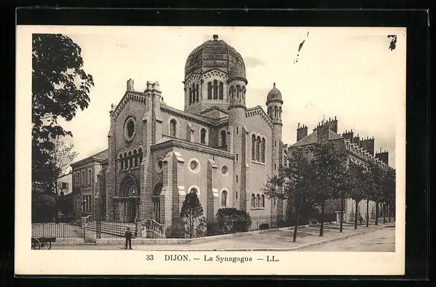 AK Dijon, La Synagogue, Totalansicht einer Synagoge in Dijon mit Person im Vordergrund