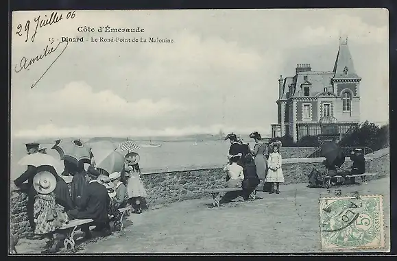 AK Dinard, Le Rond-Point de La Malouine avec promeneurs élégants et vue sur la mer