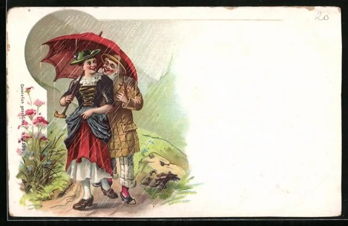 AK Dirndlmädchen mit Schirm und Gefährte im Regen