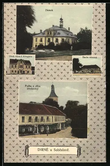AK Dirne u Sobeslave, Zamek, Posta a dum urednicky, Skola obecna