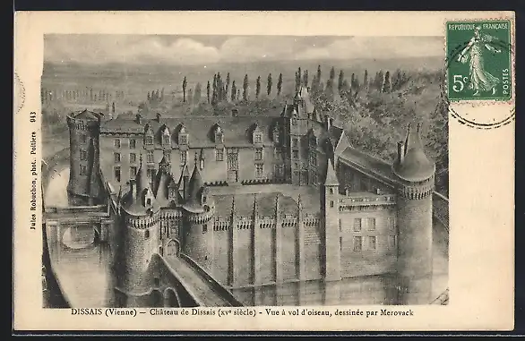 AK Dissais, Château de Dissais, XVe siècle, Vue à vol d`oiseau, dessinée par Merovack