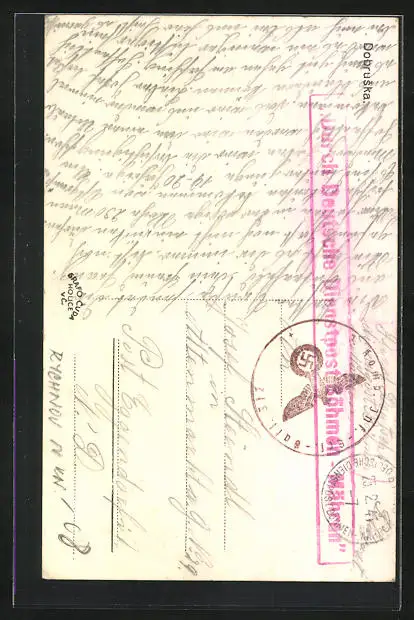 Personenbezogene Daten auf der Rückseite der Karte wurden durch blauen Textmarker unkenntlich gemacht. Die blauen Stellen sind auf die Vorderseite durchgeweicht und wirken sich negativ auf das Postkartenfoto aus