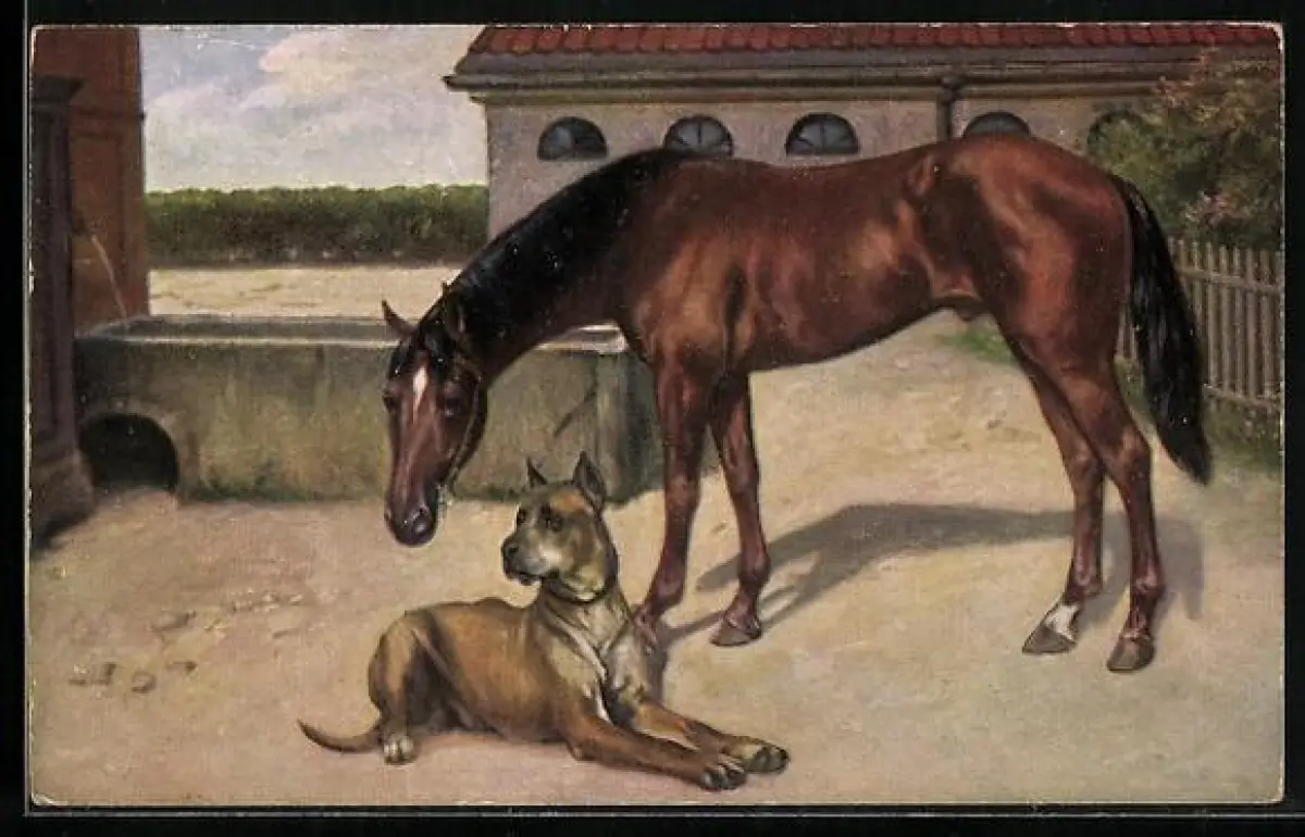 AK Dogge und Pferd vor einem Gehöft