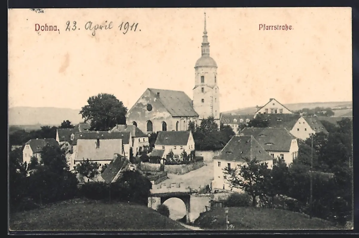 AK Dohna, Pfarrstrasse mit Torbogen und Kirche aus der Vogelschau