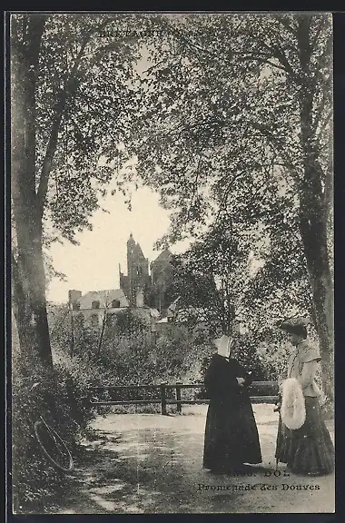 AK Dol, Promenade des Douves avec vue sur l`église et deux femmes discutant
