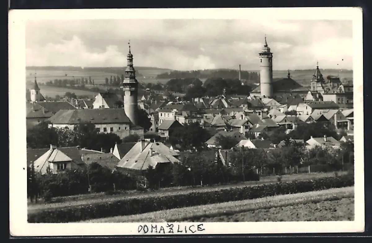 AK Domazlice, Totalansicht von einem Acker aus, Türme