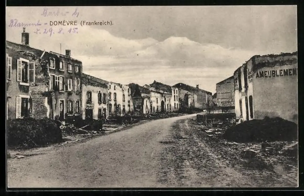 AK Domevre, Strasse mit zerstörten Häusern