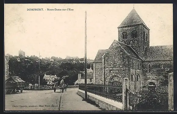 AK Domfront, Notre-Dame sur l`Eau et rue avec charrette tirée par un cheval