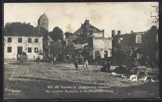 AK Domnau /Ostpreussen, Der zerstörte Marktplatz, Wie die Russen in Ostpreussen hausten